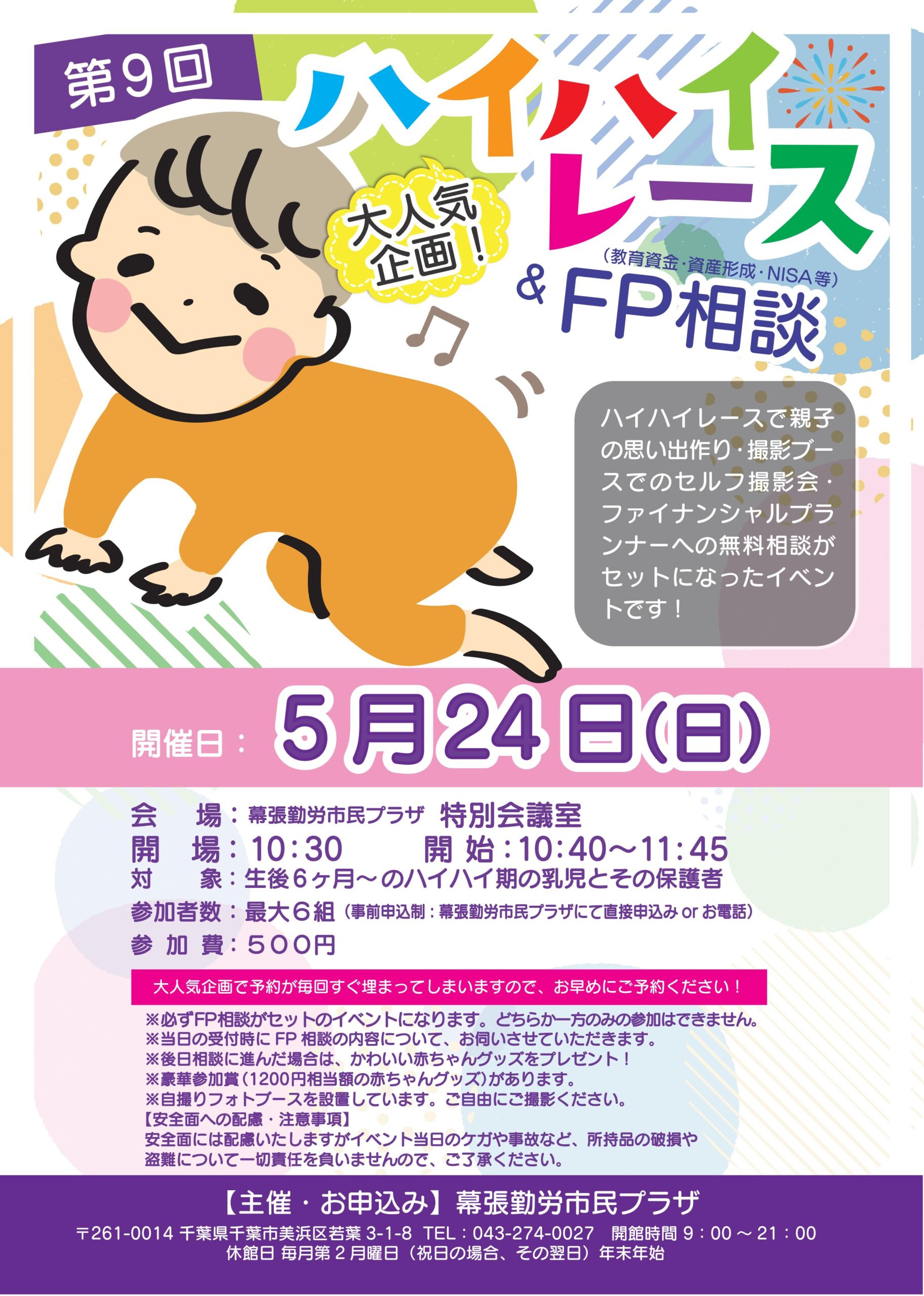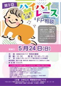 ■ ハイハイレース:10:45~10:55 ■ FP 個別相談:11:00~11:15(1組約 15分程) ※ 赤ちゃんの写真を撮っていただけるブースを設置(同時間) ■ 閉会式・表彰式:11:35~11:45 ※後日相談に進んだ場合は、しまじろうグッズをプレゼント! |
