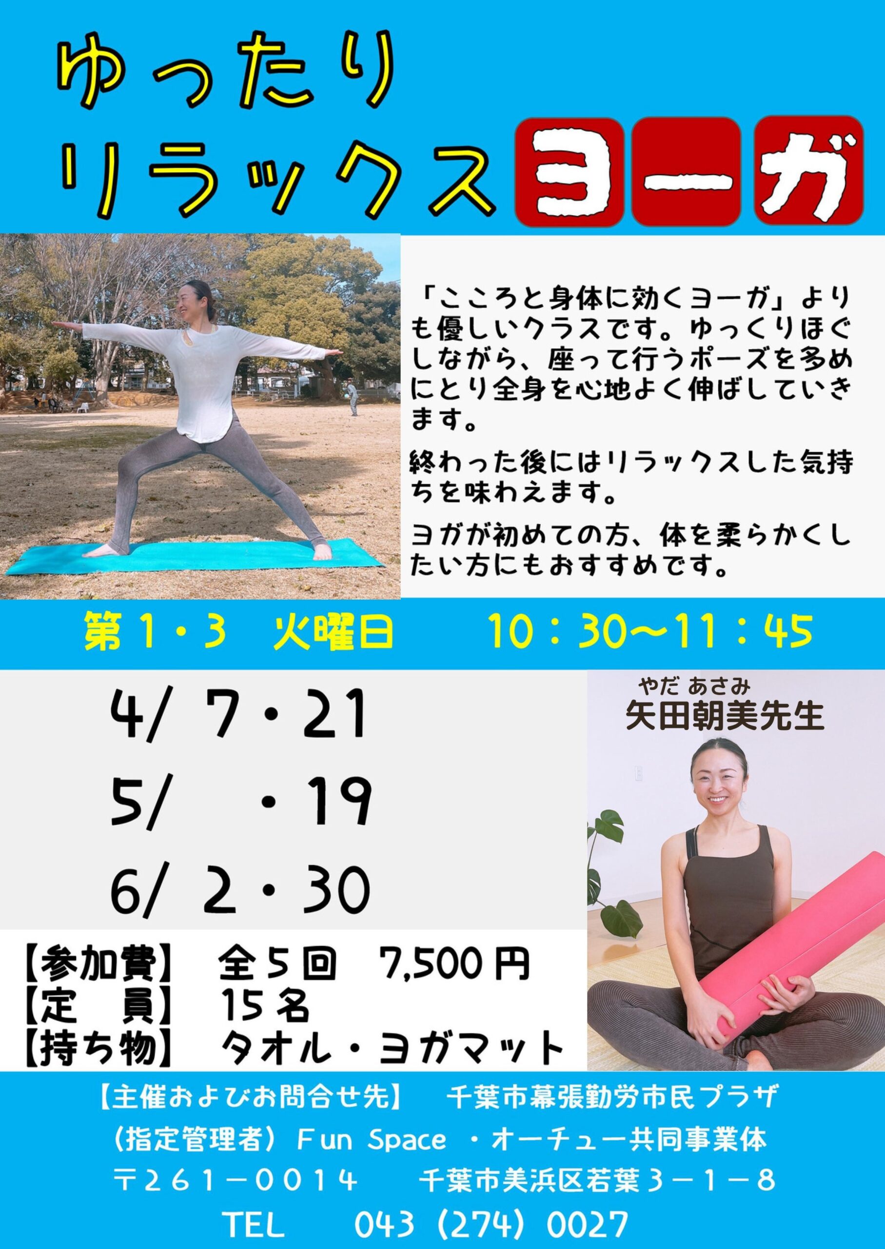 | 持ち物 | タオル、ヨガマット ※マスク着用 |