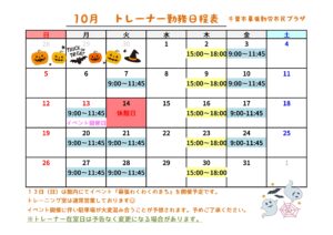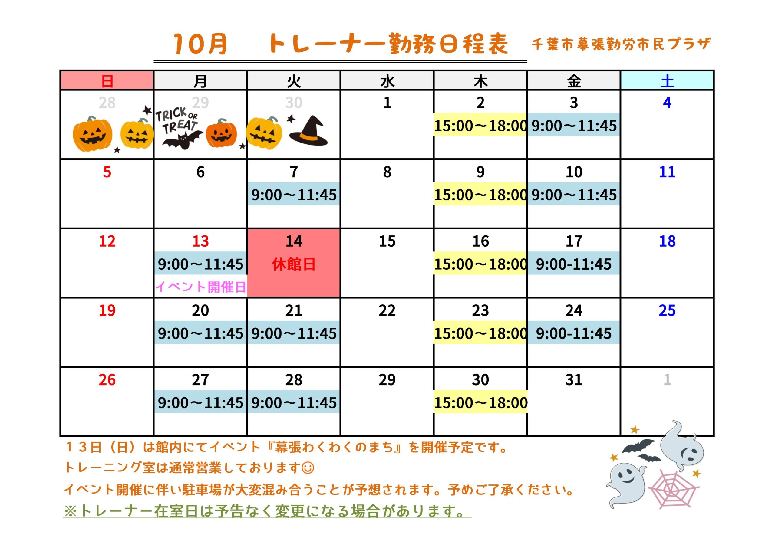 幕張勤労市民プラザトレーニング室 トレーナー在室日のご案内です。 初めてご利用になる方はもちろん、マシンの使いかたや運動のアドバイスなどお手伝いいたします。 時間帯を確認のうえ、ご利用ください。 トレーニング室はトレーナー在室時間以外にも開館しております。 詳しくは利用案内をご確認ください。 ●トレーニング室利用案内はこちら(PDF表示)トレーナー勤務日程表ダウンロードはこちら(PDF表示)