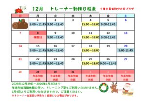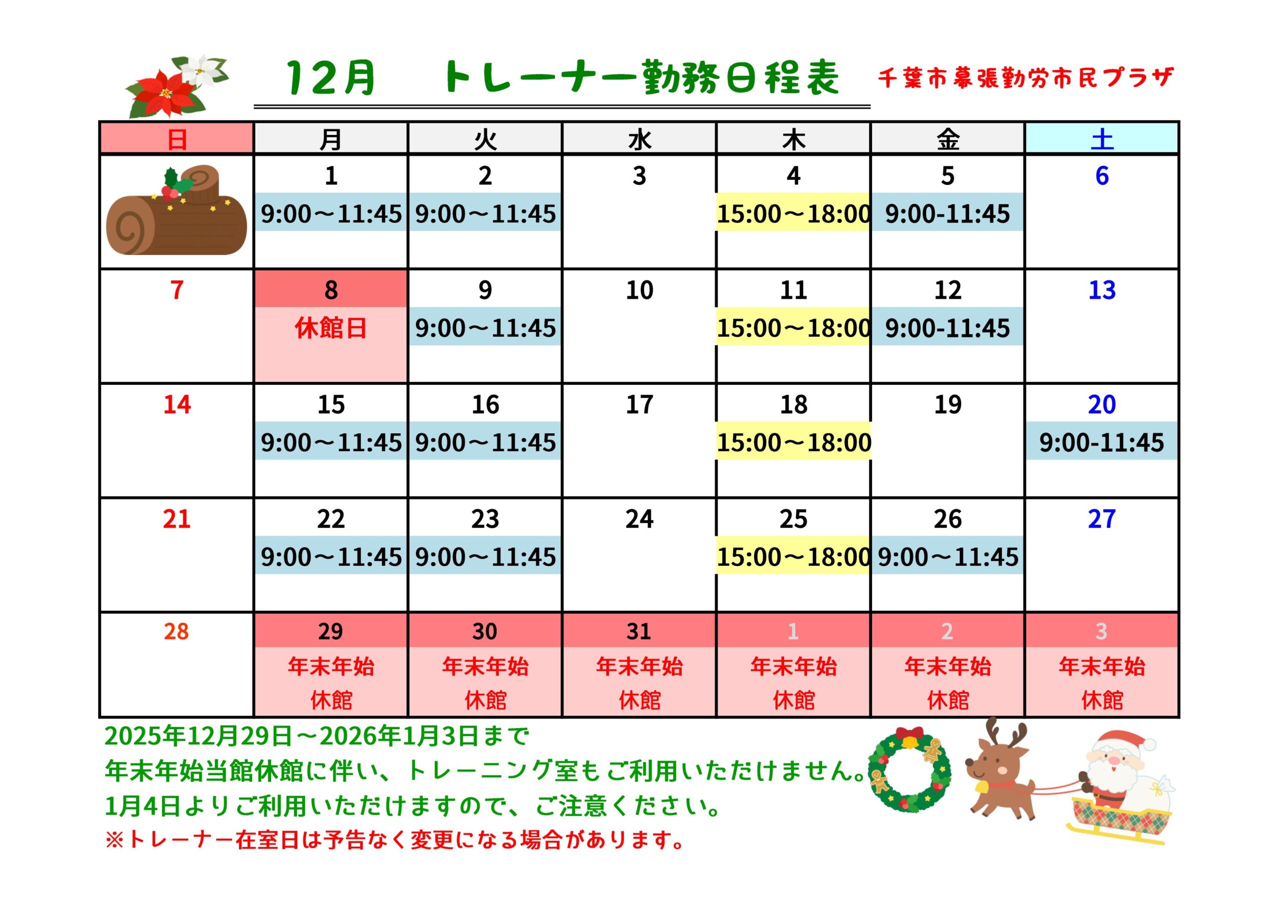 幕張勤労市民プラザトレーニング室 トレーナー在室日のご案内です。 初めてご利用になる方はもちろん、マシンの使いかたや運動のアドバイスなどお手伝いいたします。 時間帯を確認のうえ、ご利用ください。 トレーニング室はトレーナー在室時間以外にも開館しております。 詳しくは利用案内をご確認ください。 ●トレーニング室利用案内はこちら(PDF表示) トレーナー勤務日程表ダウンロードはこちら(PDF表示)