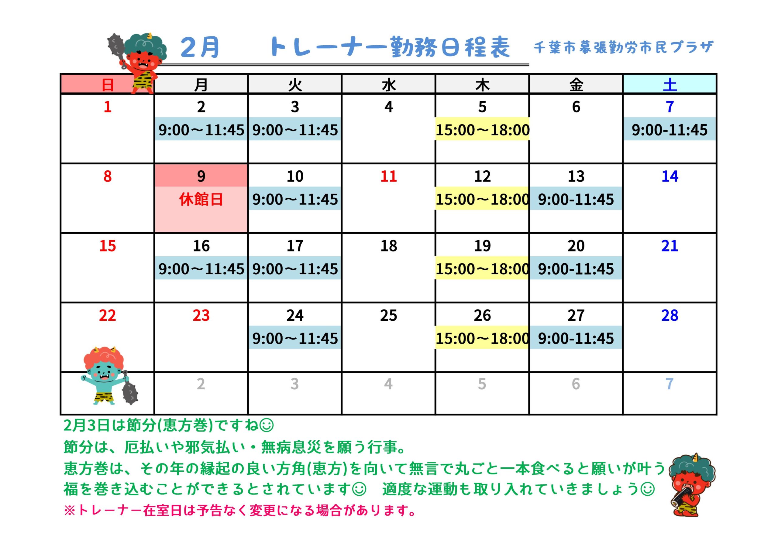 幕張勤労市民プラザトレーニング室 トレーナー在室日のご案内です。